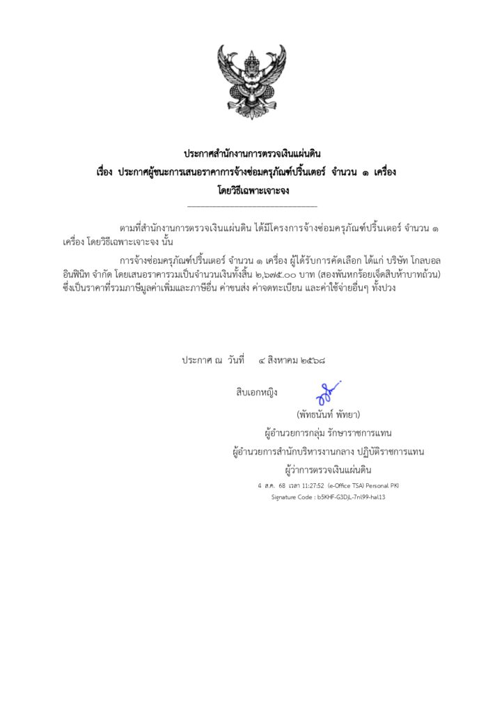 ประกาศสำนักงานการตรวจเงินแผ่นดิน เรื่อง ประกาศผู้ชนะการเสนอราคาการจ้างซ่อมครุภัณฑ์ปริ้นเตอร์ จำนวน ๑ เครื่องUncategorizedสิงหาคม 5, 2025สิงหาคม 7, 2025 Post Views: 78