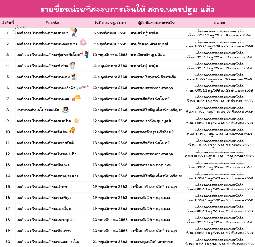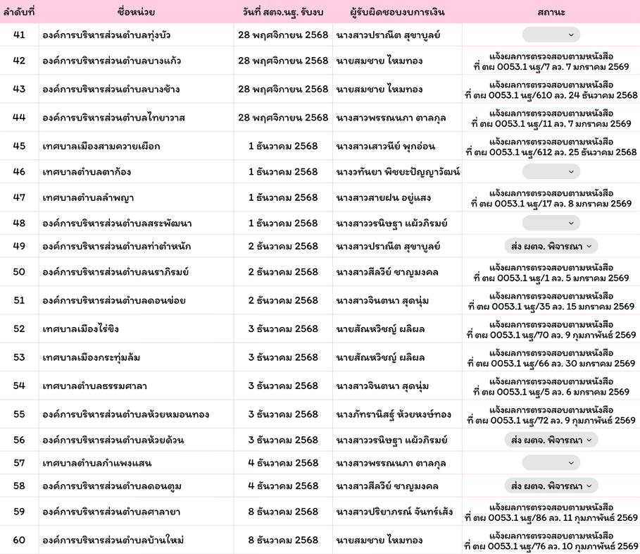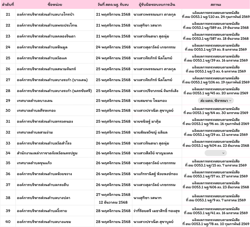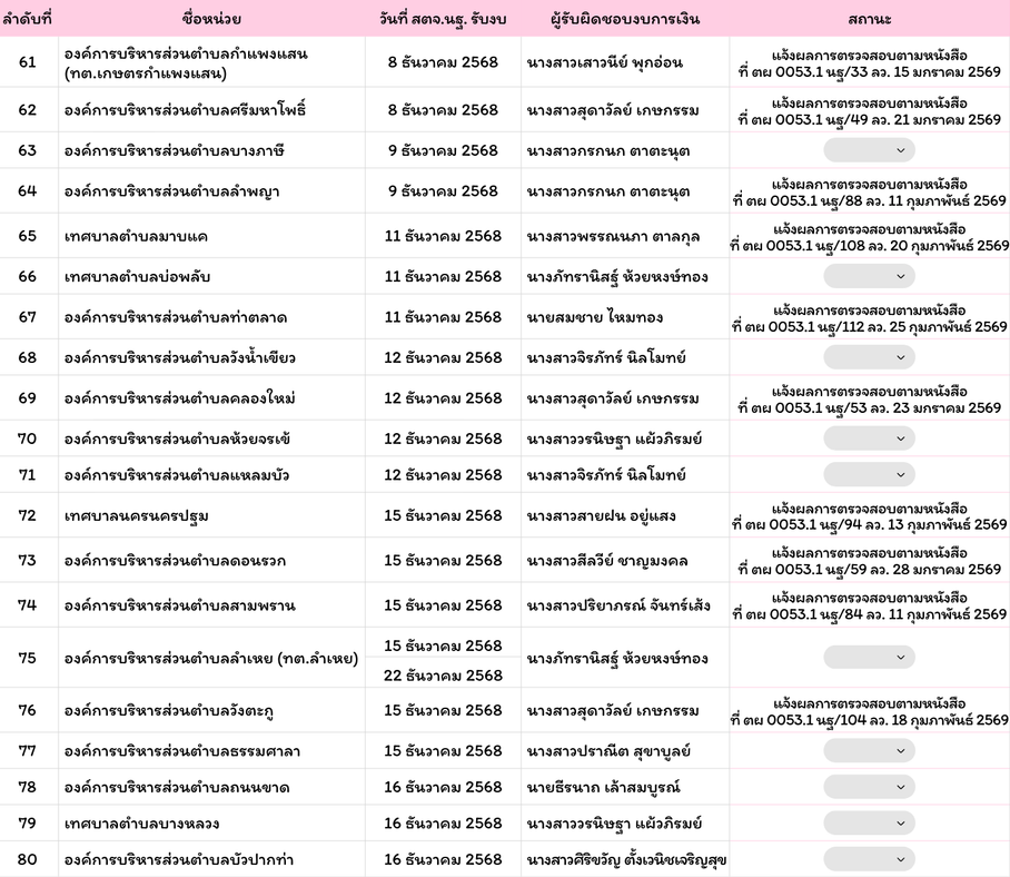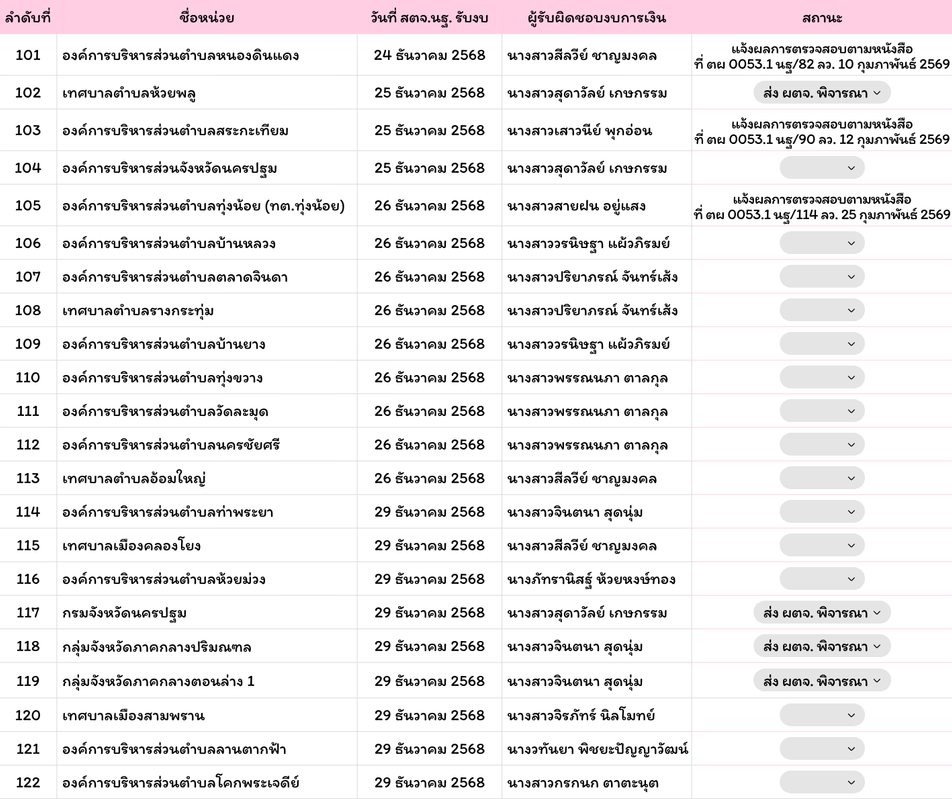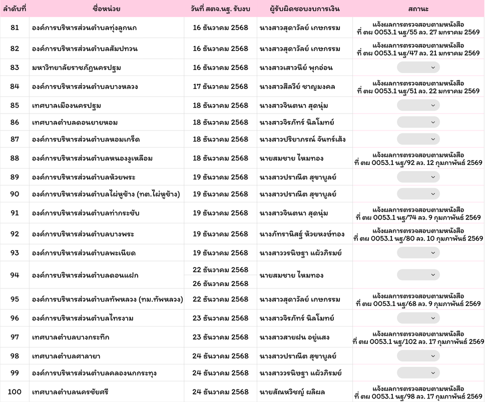 รายชื่อหน่วยรับตรวจที่ส่งงบให้ สตจ.นครปฐม แล้วรายชื่อหน่วยรับตัวที่ส่งงบแล้วพฤศจิกายน 28, 2025กุมภาพันธ์ 25, 2026 Post Views: 296 ณ วันที่ 25 กุมภาพันธ์ 2569 ออกรายงานแล้ว 74 หน่วย