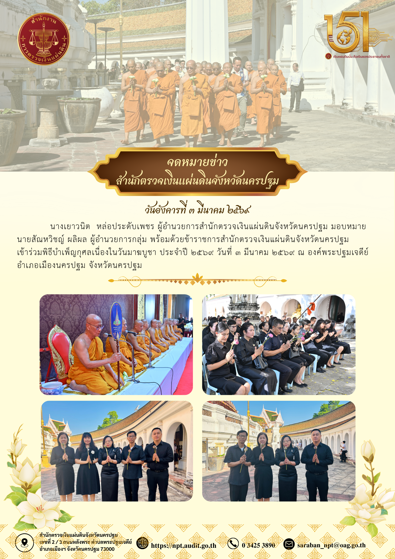 นางเยาวนิต หล่อประดับเพชร ผู้อำนวยการสำนักตรวจเงินแผ่นดินจังหวัดนครปฐม มอบหมาย นายสัณหวิชญ์ ผลิผล ผู้อำนวยการ กลุ่ม พร้อมด้วยข้าราชการสำนักตรวจเงินแผ่นดินจังหวัดนครปฐม เข้าร่วมพิธีบำเพ็ญกุศลเนื่องในวันมาฆบูชา ประจำปี 2569 วันที่ 3 มีนาคม 2569 ณ องค์พระปฐมเจดีย์ อำเภอเมืองนครปฐม จังหวัดนครปฐม