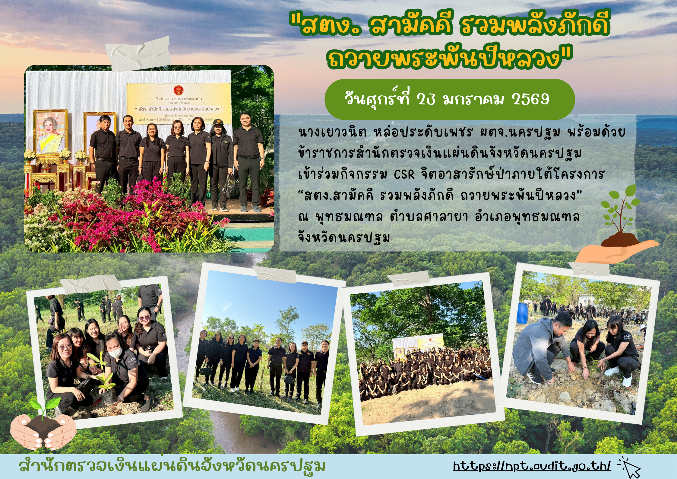 23-1-2569 สตจ.นครปฐม ร่วมกิจกรรม “สตง. สามัคคี รวมพลังภักดี ถวายพระพันปีหลวง”กิจกรรมเพื่อสังคม, ภาพกิจกรรมมกราคม 23, 2026มกราคม 23, 2026 Post Views: 95